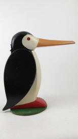 Figures can be cut out and glued together in layers. Here is a penguin with the center thick enough for a hinge, and thinner pieces of wood applied for the wings. Note the indentation to hold the nut steady while cracking. This type could be made with other bird with long beaks, an elephant, or a man with long nose. |